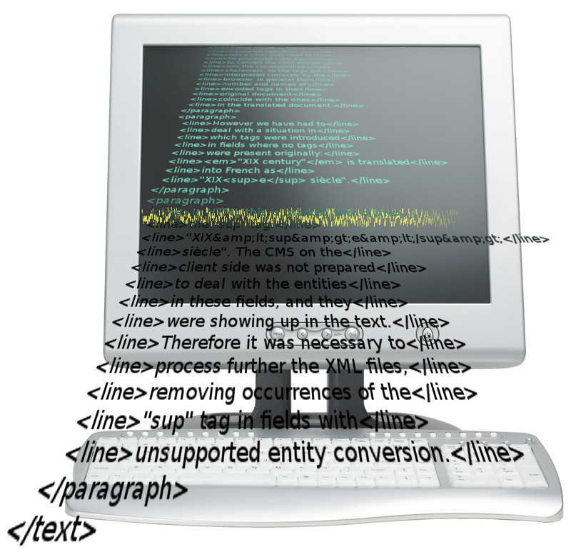 Before importing the translated segments, say into a CMS, they need to be processed once again to convert the html entities into the corresponding characters, so the tags get interpreted correctly by the browser. In general the number and names of encoded tags in the original document coincide with the ones in the translated document. However we have had to deal with a situation in which tags were introduced in fields where no tags were present originally: “XIX century” is translated into French as “XIXe siècle”. In HTML this is marked with the “sup” tag: “XIX<sup>e</sup> siècle”. The CMS on the client side was not prepared to deal with the entities in these fields, and they were showing up in the text. Therefore it was necessary to further process the XML files, removing occurrences of the “sup” tag in fields with unsupported entity conversion.