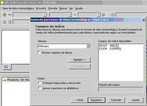5. En INDEX FIELD, seleccione primero el idioma fuente y luego el idioma meta. Puede completar DESCRIPTIVE FIELD si el glosario contiene, además, algún tipo de información adicional, por ejemplo, referencias. Finalmente, haga clic en NEXT.
