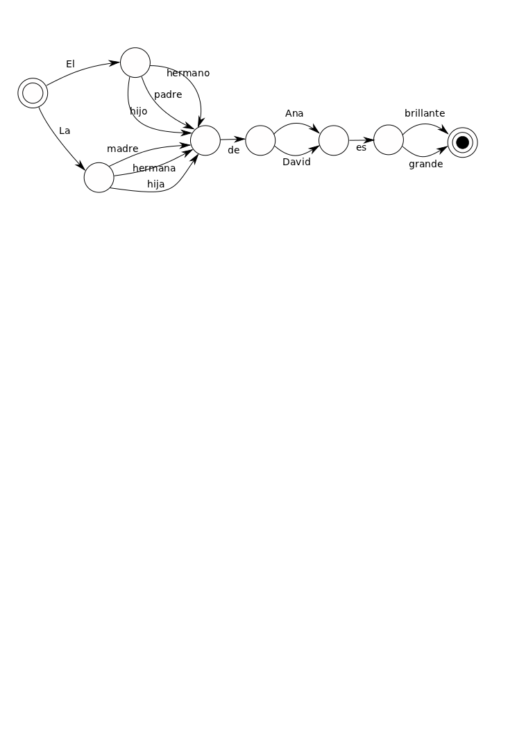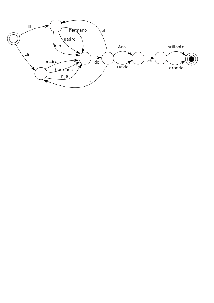 La correspondiente máquina de estados finitos reconoce estas dos oraciones, más las otras 22 que pueden crearse con ellas (escribirlas queda como ejercicio divertido para el lector). Consta de una cantidad de estados unidos por flechas etiquetadas que representan transiciones de un estado a otro. Hay un estado inicial especial y otro estado final especial: